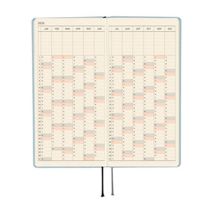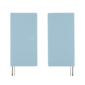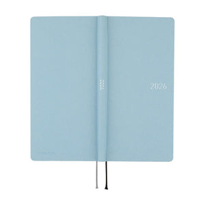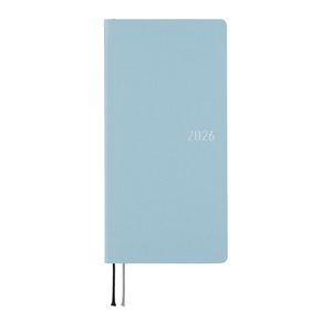 The Hobonichi Techo Weeks is a compact planner with a weekly spread, offered in a variety of cover designs and colors. Paper Series: Sky is a bright blue reminiscent of a hazy spring sky. At first it seems single-colored, but up close a fine glitter layer reveals an elegant sparkle in the light. “2026” is stamped in silver foil.