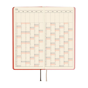 Slim and portable—about the size of a long wallet—this English-language planner pairs each weekly spread with a blank page for notes, plus 71 additional grid pages, monthly calendars, and a habit tracker. Like all Hobonichi planners, it’s made with thin yet strong Tomoe River paper, allowing for a large number of pages in a slim profile.