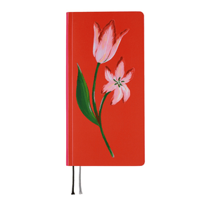 The Hobonichi Techo Weeks is a compact planner with a weekly spread, offered in a variety of cover designs and colors. Tolight: A Bright Year is adorned with a tulip illustration by the designer TOLIGHT on the front cover, with nandina fruit and coralberries on the back. The matte cover is accented by flowers finished in glossy print, giving them a subtle shine.