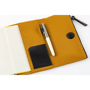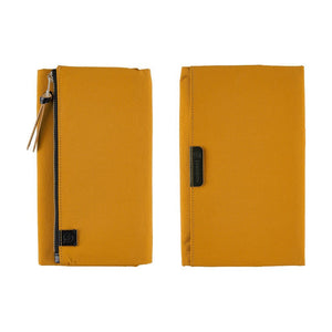 Extend the life of your Hobonichi Weeks with the Tragen cover, which adds plenty of pockets for storing journaling supplies. The durable nylon fabric is an earthy yellow shade. This tri-fold design closes with a button, features a zippered pocket for pens and stationery, and includes an interior pen hook for secure storage.
