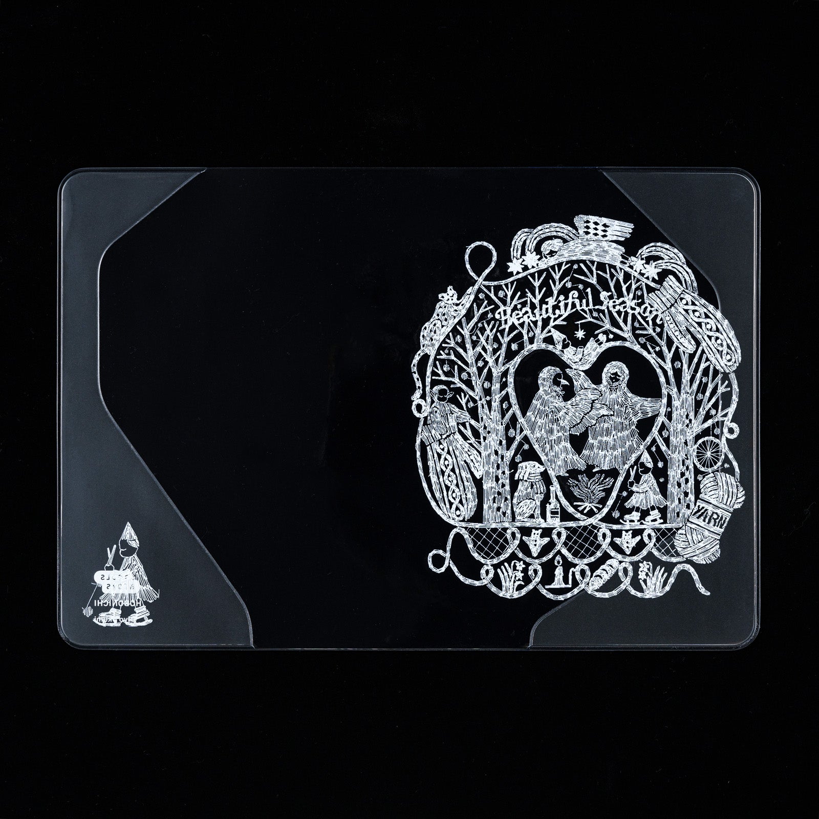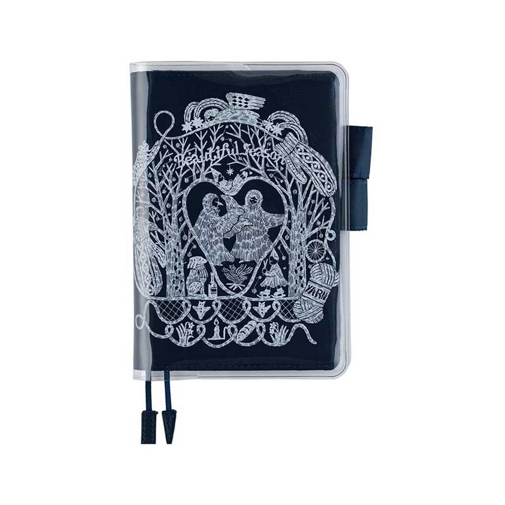 This clear cover fits onto a Hobonichi Techo A6 cover to protect it from wear and tear and features a print from embroiderer and illustrator Iyo Okumi's embroidered artwork. When placed over a solid-color Techo cover, the print stands out. This one is called "Beautiful Season" and depicts the beauty of the winter season.