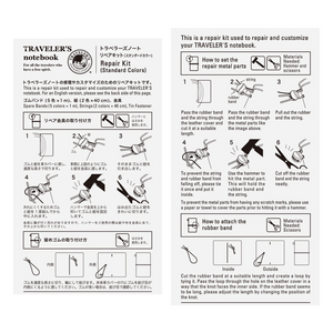 A repair kit for the Traveler's notebook. Included in each pack is a small metal charm, five sets of elastic bands, and two strings to use as bookmarks. Repairing loose or broken bands helps extend the longevity of your Traveler's notebook so you can keep using it for years. This kit works with both Regular and Passport sized notebooks.