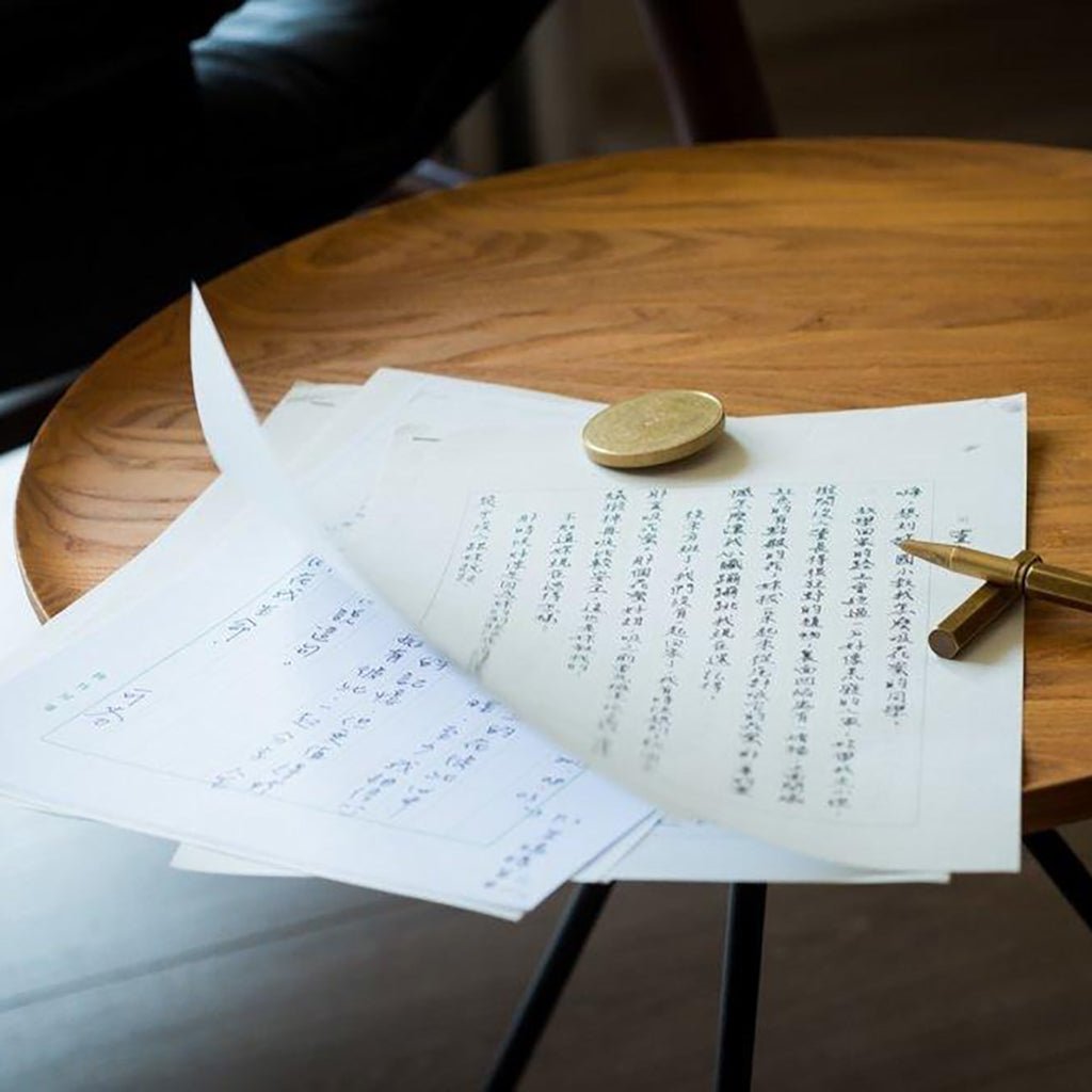 A small but weighty paperweight cut from solid brass. Its simple form and 3.2 oz heft keep papers in place without taking up much space. One side features a shallow cone shape; the other is flat — use either side depending on your preference.