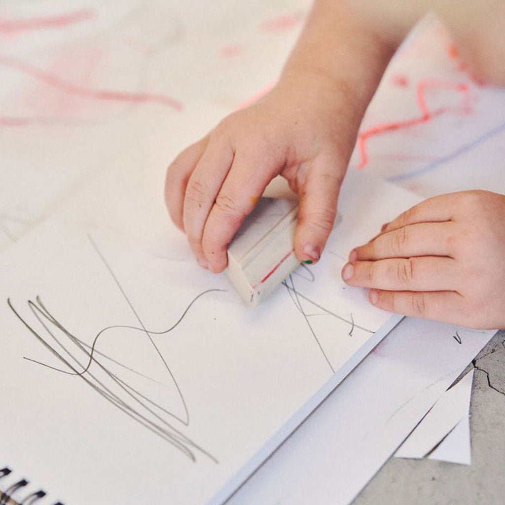 A children's eraser with three uniquely shaped corners and a bottom edge to tackle a variety of erasing tasks. The generous size is easy to grip, while the material erases with minimal pressure.