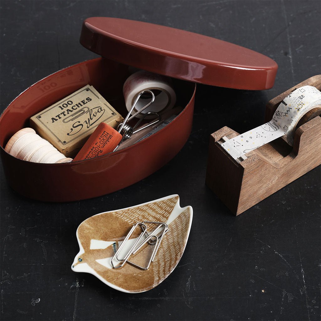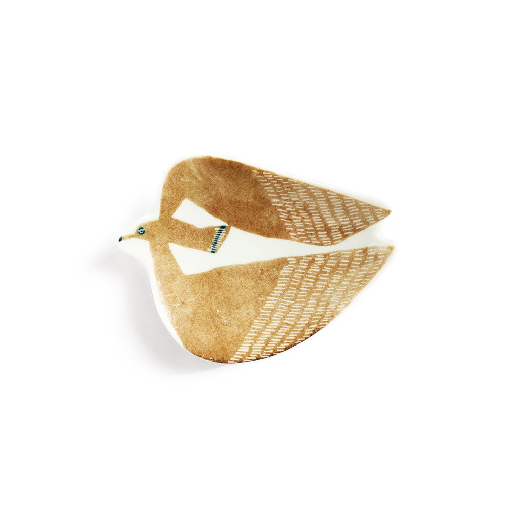 A small ceramic dish useful for organizing stationery items on the desk, for catching coins or keys on the entry table, or as a tea bag holder or chopstick rest. This dish features a soaring albatross with large wings.