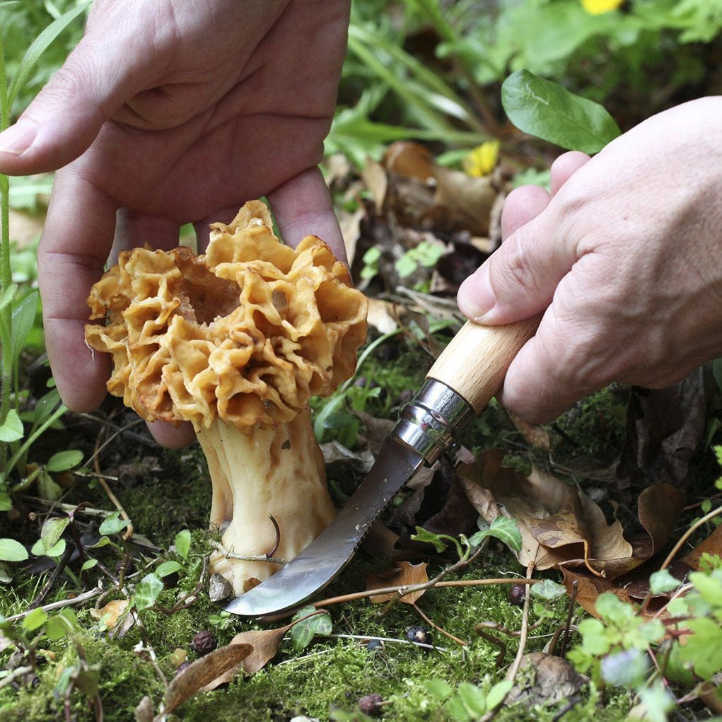 Heralded by foragers around the world as the mushroom knife to have, Opinel's No. 8 Mushroom Knife features a sharp stainless steel curved blade to cut delicate fungi in hard-to-reach places. With a serrated edge on the back of the blade to scrape off debris, and a boar's hair bristle brush on the end of the handle to wipe away dirt, it features built in tools to help with cleaning while out in the field!
