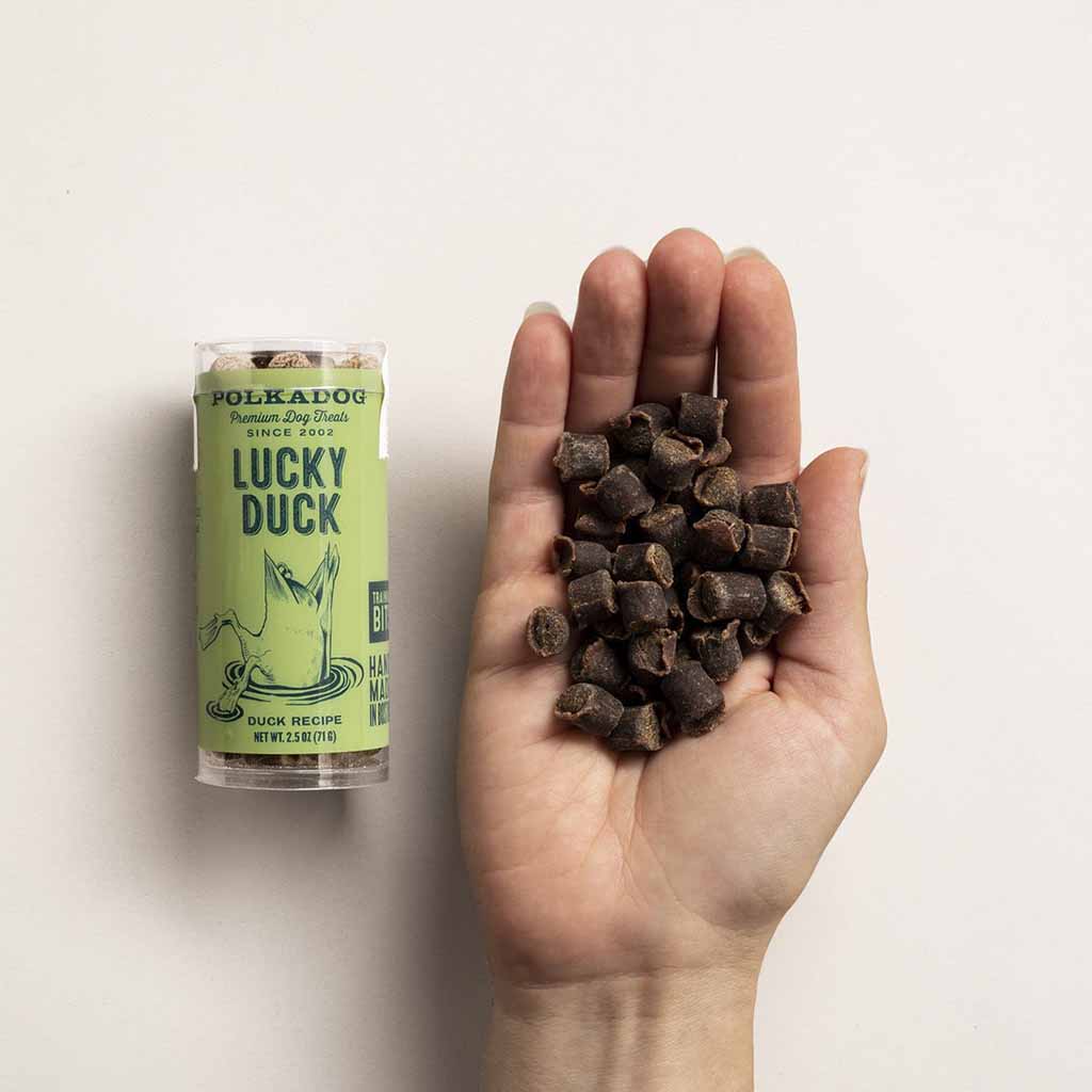 Nothing says decadence quite like Polkadog's deydrated duck liver dog treats. These crunchy, grain-free nuggets are handmade daily in Polkadog's Boston Fish Pier kitchen with locally sourced US duck liver and natural potato flour. They're perfectly sized for training on the go.