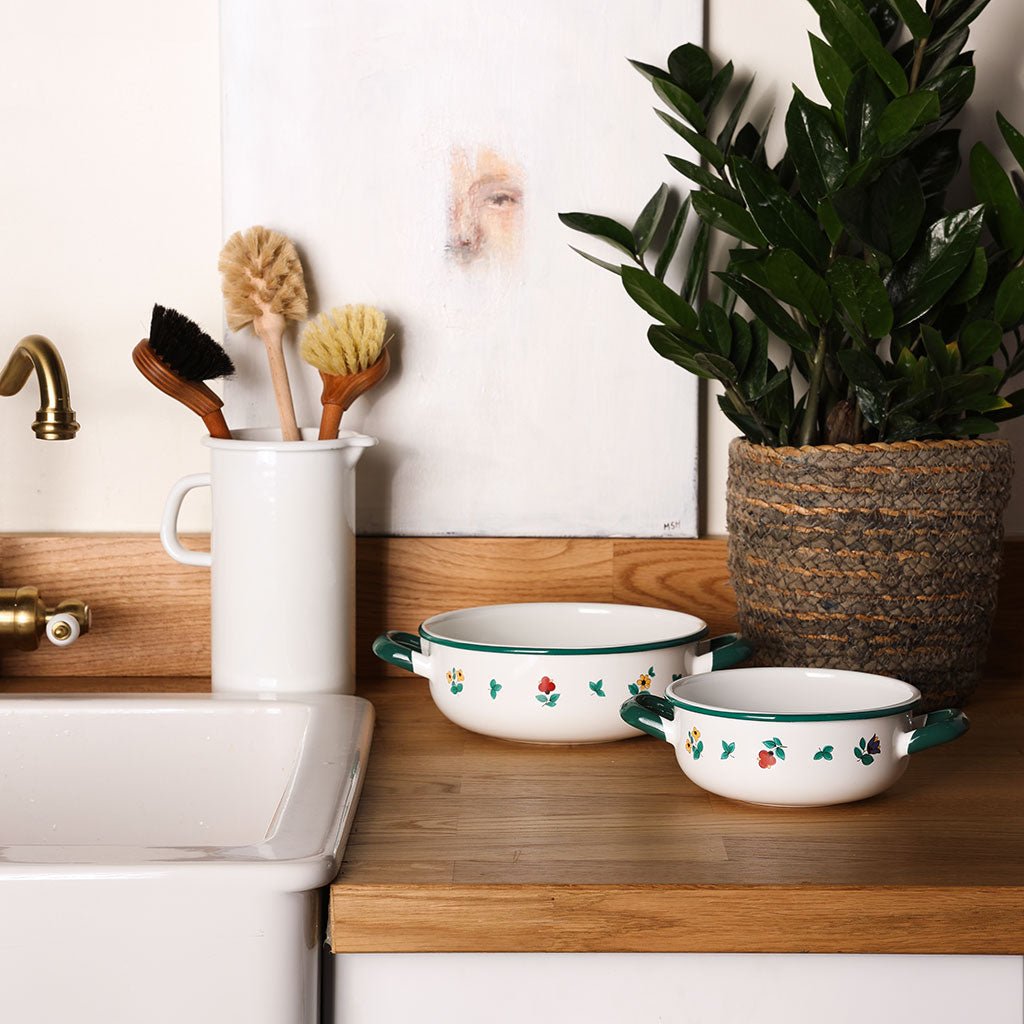 Handmade in Austria, these enamel Farmer's Bowls go from kitchen to table with their versatile size and hand-painted floral design. Choose from two sizes; double handles make for easy transporting of anything from dips and salsas to side dishes and fruit salads.