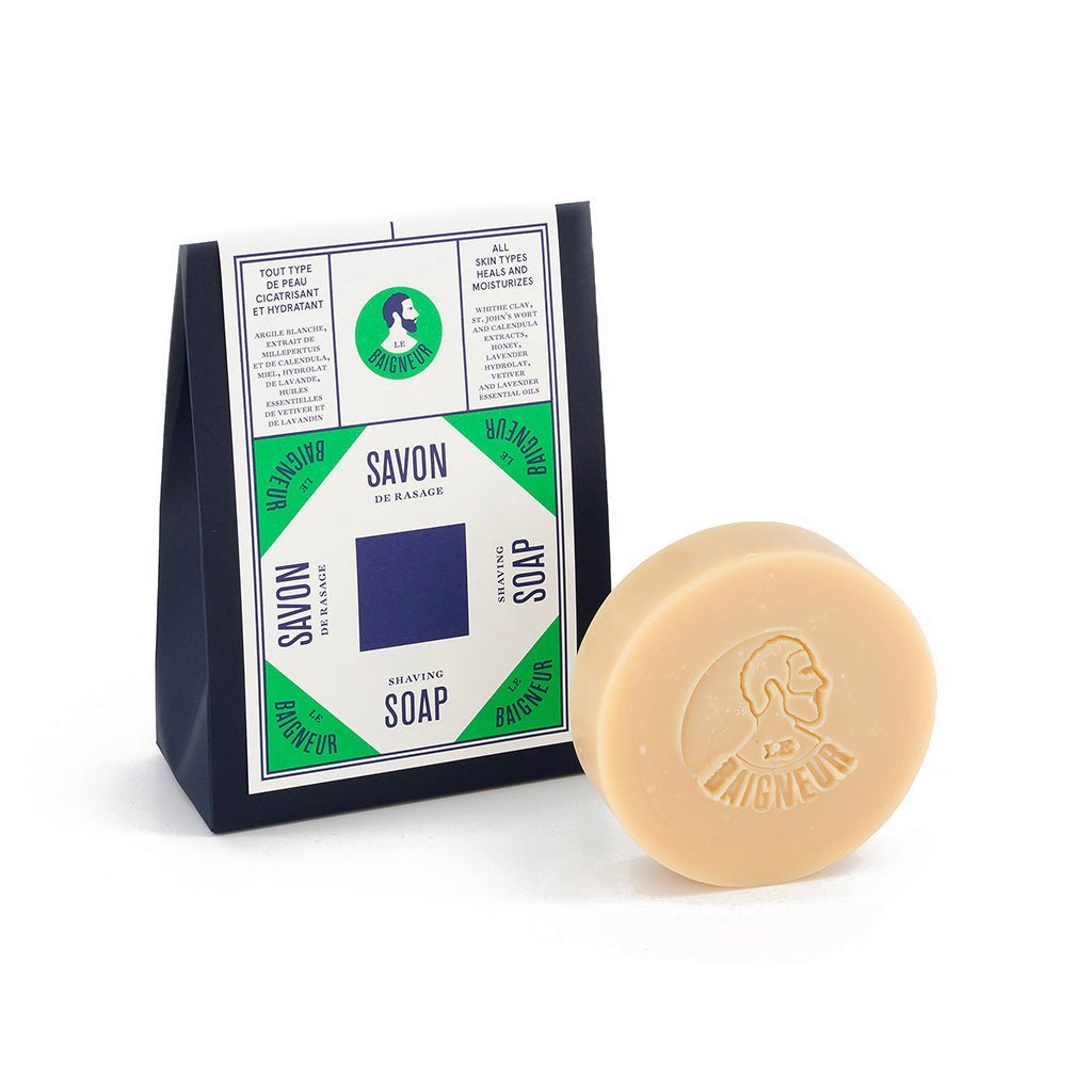 Enriched with extracts of calendula and St. John's wort, white clay, honey from Ile de France, and lavender hydrosol from Provence, this shave soap is gently scented with essential oils of vetiver and lavender and lathers up to a rich foam for shaving.