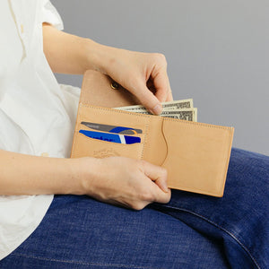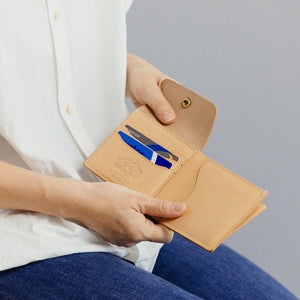 The two-fold silhouette offers just enough room for folded cash and essential cards. A smartly placed exterior coin pocket keeps bulk to a minimum, while a single leather flap secures both the coin pouch and main compartment. Finished with a sturdy snap closure, it’s a wallet that pairs lasting functionality with timeless craftsmanship.