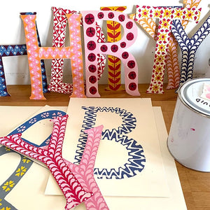 Thirteen large, double-sided, patterned card letters spell out HAPPY BIRTHDAY. The letters are in assorted colors and designs, all with a strong folk art aesthetic. String them together on yarn or ribbon of your choice (not included). The finished banner will measure between 2 and 3 yards long.