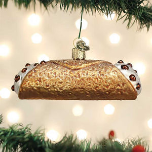 Treat the dessert lover in your life this holiday season with this glass cannoli ornament. Hand-painted and glittered, this beloved Italian pastry adds a sweet touch to any Christmas tree.