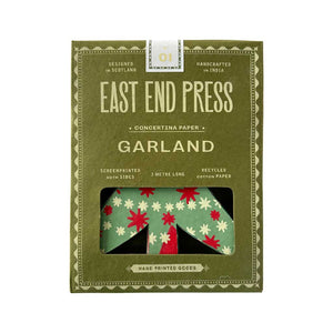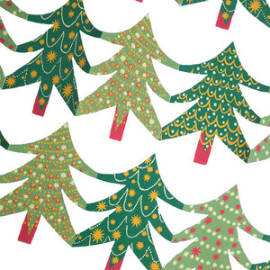 Deck your halls with this festive Christmas tree concertina garland by East End Press. Handcrafted from sustainably sourced, recycled materials, it unfolds to reveal four repeating designs—each tree adorned with glittering lights and stars. Screen-printed with pops of metallic ink, this decorative garland brings a sparkling touch of holiday spirit to any mantle, wall, or windowsill.