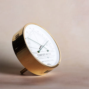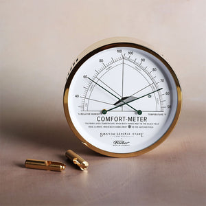 Our Comfort Meter is housed in a brass casing and features our custom wording, logo, and dark green needles. The color of the brass will deepen over time and acquire a warm patina, lending an antique feel.