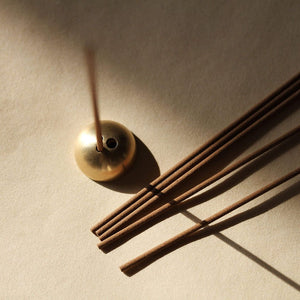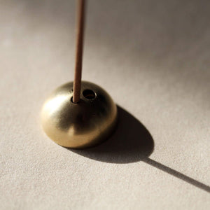 A minimalist brass dome incense stick holder. Simple, functional, and beautiful, it holds three widths of incense stick.