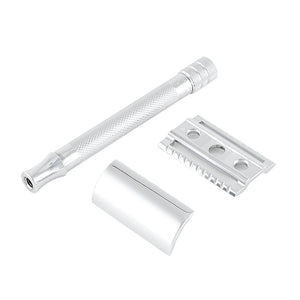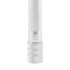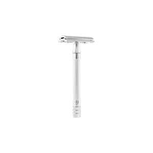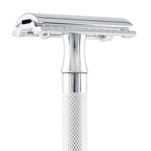 A stainless steel double-edge safety razor with a closed comb and etched handle. The Merkur 23C was originally developed in the 1920s. The extra long, easy-to-grip handle is finished with chrome for corrosion resistance.