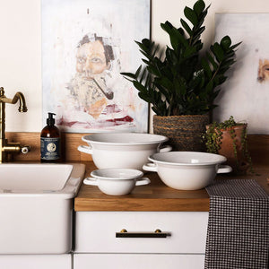 The bowls have rounded rims — known as rolled rims in enamel terms — and are available in three sizes. Use them as mixing bowls, for bread kneading and rising, or as serving bowls. The smallest bowl is perfect for ingredient prep or for eating cereal or oatmeal. The shiny enamel finish looks great from the counter to the table.