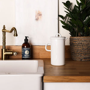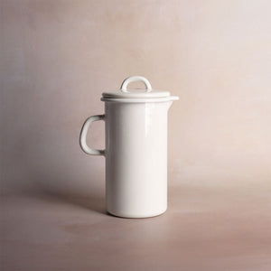 An enamel jug, handmade in Austria by Riess. Due to its iron core, enamel retains cold temperatures for an extended amount of time. It also keeps hot liquids warm longer than ceramic.