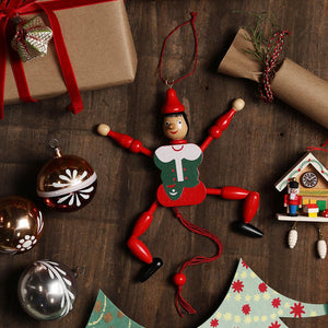 Handcrafted in Germany, this festive Jumping Jack Pinocchio Ornament brings storybook charm to the Christmas tree. Painted by hand in bright colors with golden accents, the playful figure comes to life with a gentle pull of the string, his arms and legs moving in cheerful motion. A classic nod to traditional German toy making, it’s a keepsake that celebrates the joy and craftsmanship of a simpler time.