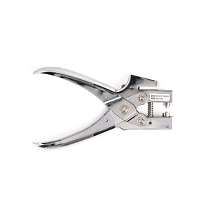 We chose this punch/pliers in particular for its steel construction and for its precision and adjustability. The tool both punches a hole and creates the eyelet around it. Hole distances can be adjusted with the 0.5" measuring gauge, and the punch can create clean 4.5mm holes through multiple sheets of paper. The punch depth is adjustable between 5mm and 13mm.