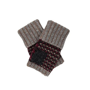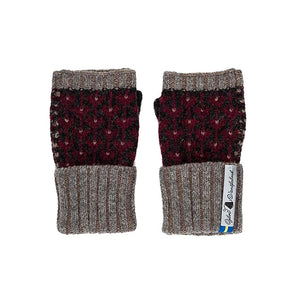Made from 100% organic merino wool, this Swedish-knit wrist warmer features a traditional Nordic pattern. The Embla & Erling design celebrates love with rows of stylized wine-colored hearts on a deep charcoal gray field with gray accents.