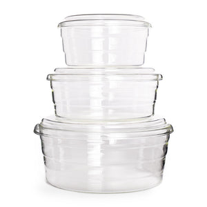 Trendglas JENA's Centric Glass Dishes are a practical and eco-friendly choice for your cooking and food storage needs. Made with heat-resistant borosilicate glass, the non-porous surface wont retain odors or flavors and is non-toxic, eliminating concerns about BPA in foods. These glass dishes are a durable alternative to plastic food storage containers.