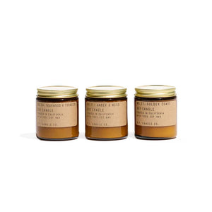 The set features three signature P.F. scents: Amber & Moss, Golden Coast, and Teakwood & Tobacco. Each mini candle is carefully hand-poured into an amber glass jar and finished with a brass lid and P.F.'s iconic kraft paper label.