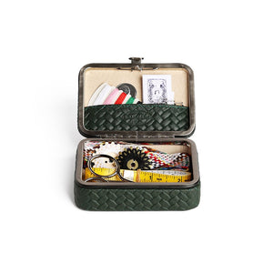 This leather-bound sewing case is a refined companion for life’s small mending moments. Wrapped in embossed green leather and lined with soft suede, it closes with a sturdy clasp that keeps contents secure and accessible. Inside, essential sewing tools are thoughtfully stored—ready for quick repairs or handiwork.