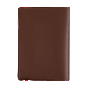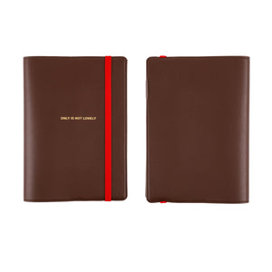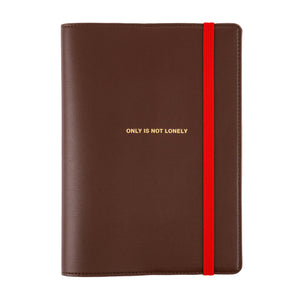 A smooth leather-like cover designed to fit the Hobonichi Techo Cousin A5. This lightweight cover features the message "Only is not Lonely" stamped in gold foil on smooth chocolate brown. The cover stays closed with a contrasting red elastic band and has a hook to store a pen by its clip.