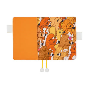 This cover's scurry of squirrels design by 100%ORANGE adds a playful touch to your Hobonichi, while also keeping your planner protected and organized. This A6 cover has butterfly-style pen loops to keep your writing utensil handy, as well as securing the cover shut. When open, you'll find a bright yellow interior with ample pockets for keeping stickers, clippings, and other bits of daily ephemera.