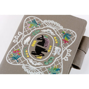In a calming warm gray color, the A6 cover has butterfly-style pen loops to keep your writing utensil handy, while also securing the cover shut. The cover's outer design features one of iyo okumi's stunning embroidery pieces, with a white lace border accenting the charming motifs of animals and florals. When open, you'll find a clean and minimalist interior with ample pockets for keeping stickers, clippings, and other bits of daily ephemera.