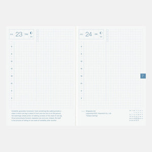 This A6-size, English-edition planner features a page-per-day format and is designed for use with a Techo A6 Cover or compatible A6 covers from other makers. Hobonichi’s thoughtful design, refined through years of customer feedback, shines in every detail—from the width of the 3.7mm grid lines to the rounded page corners. The thread-stitched binding with flexible reinforcement allows the book to lay flat, ensuring durability and ease of use.