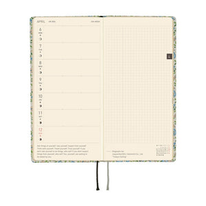 The Hobonichi Techo Weeks is a compact planner with a weekly spread, offered in a variety of cover designs and colors. Liberty Fabrics: Sasha Kiora features a delicate floral pattern reminiscent of the pastoral illustrations by picture book author Kate Greenaway. The year 2026 and the Hobonichi logo are finished with gold foil stamping.
