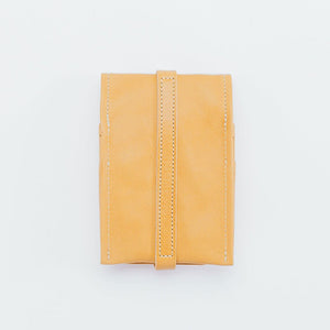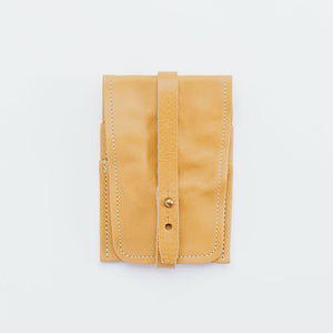 Made with oiled leather with a washed finish, the tool holder will soften beautifully with age. The deeper of the two pockets can accommodate items around 5.25" long. The shorter pocket is around 2.8" deep.