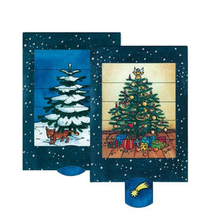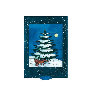 At first glance, a playful fox is spotted lounging under a pine tree. Pull the tab to reveal a heartwarming transformation—a delightful scene unfolds with a pile of presents nestled beneath a decorated Christmas tree!