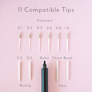A set of eleven Japanese-made fiber and brush tips for your Tom's Studio Lumos Pro Duo Pen, including a fineliner, writing, brush tip, bullet tip, and chisel tip. A handy card holds the tips and helps you keep track of which ones you are using.