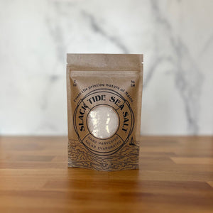 Slack Tide produces this flaky finishing salt in small, hand-harvested batches pulled from the deep, crisp waters off the coast of Maine. Harvesting is done at the high slack tide for the freshest, clearest ocean water. The water is then concentrated into brine using solar greenhouses in a process that is more energy efficient than other forced evaporation methods.