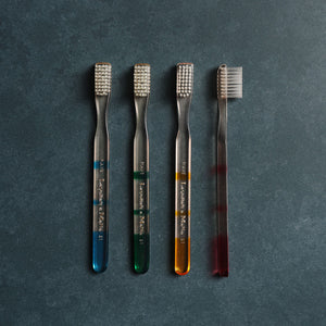 Piave's Lavorati a Mano toothbrushes are premium quality cellulose acetate toothbrushes that are handmade in Italy. The Paris toothbrush features clear bands of color on a clear, colorless base and medium firmness nylon bristles on a squared head.