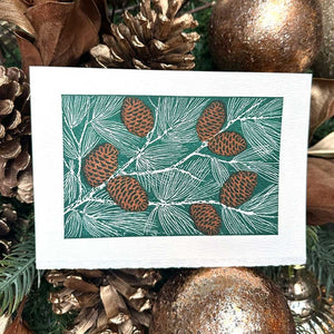 Straight from the forest to your mailbox, send warm holiday wishes with a touch of rustic charm. Letterpress printed by hand, this Saturn Press greeting card features pinecones nestled among evergreen branches—full of festive spirit inspired by the peaceful beauty of winter.