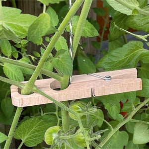 These wooden clamps are specially designed for climbing plants, functioning like spring-loaded clothespins but with wide holes for stems to pass through. They are perfect for supporting delicate stems in your garden, preventing them from bending or breaking. Ideal for beans, tomatoes, cucumbers, sweet peas, and other plants, these clamps are crafted from untreated beechwood, offering an eco-friendly alternative to plastic garden supports.