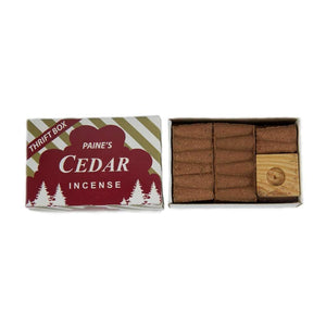 Red Cedar Incense by Paine’s evokes memories of crackling campfires and cozy firesides. Made in Maine from pressed cedar wood, each cone burns slowly in the included holder, filling your home with the natural, woodsy fragrance of burning cedar.