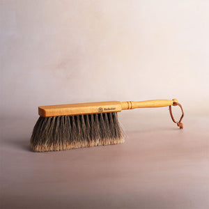 Split horsehair is an ideal material for a dust brush as the fine, static-resistant bristles are good for sweeping up particles of dust, sand, and dirt. The solid wooden handle features a leather loop for hanging.