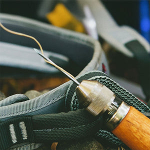 This all-in-one tool includes high-tensile waxed polyester thread and custom-made diamond point needles, and is designed to create a tight lock stitch—the same kind of stitch you’d get from a sewing machine. With a little practice, it sews cleanly and consistently.