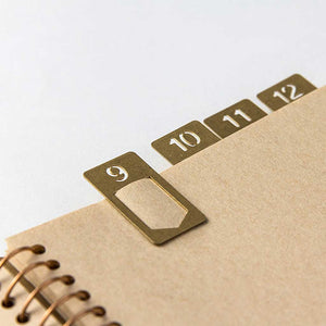 These 12 brass number clips are perfect for use with your Traveler's Notebook, or anywhere you need help organizing pages or files. They can be used as index tabs, bookmarks, or month markers. The brass will patina over time, adding character with age.