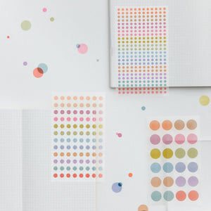 These 12-color transparent dot stickers from Hobonichi's TSUKI no IRO line are designed to make organizing your planner simple and enjoyable. These colorful, round stickers are made from a durable, clear PET material that makes it easy to see your writing underneath. Available in three sizes, use them to build a to-do list, label important days, attach memos to your planner, or simply decorate your pages.