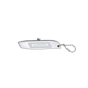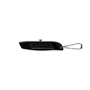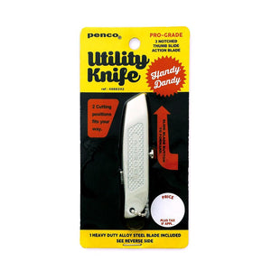 A pocket-sized metal utility knife by Penco. At just over 3" long, it tucks nicely into a pocket or bag. Comes with a heavy duty steel blade and a beaded chain which keeps it handy and at-the-ready for opening boxes or snipping strings and cords. The button on top locks the blade in two positions, for two blade lengths. The knife is endlessly refillable with replacement blades.