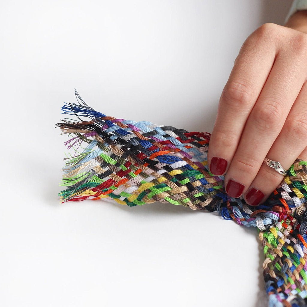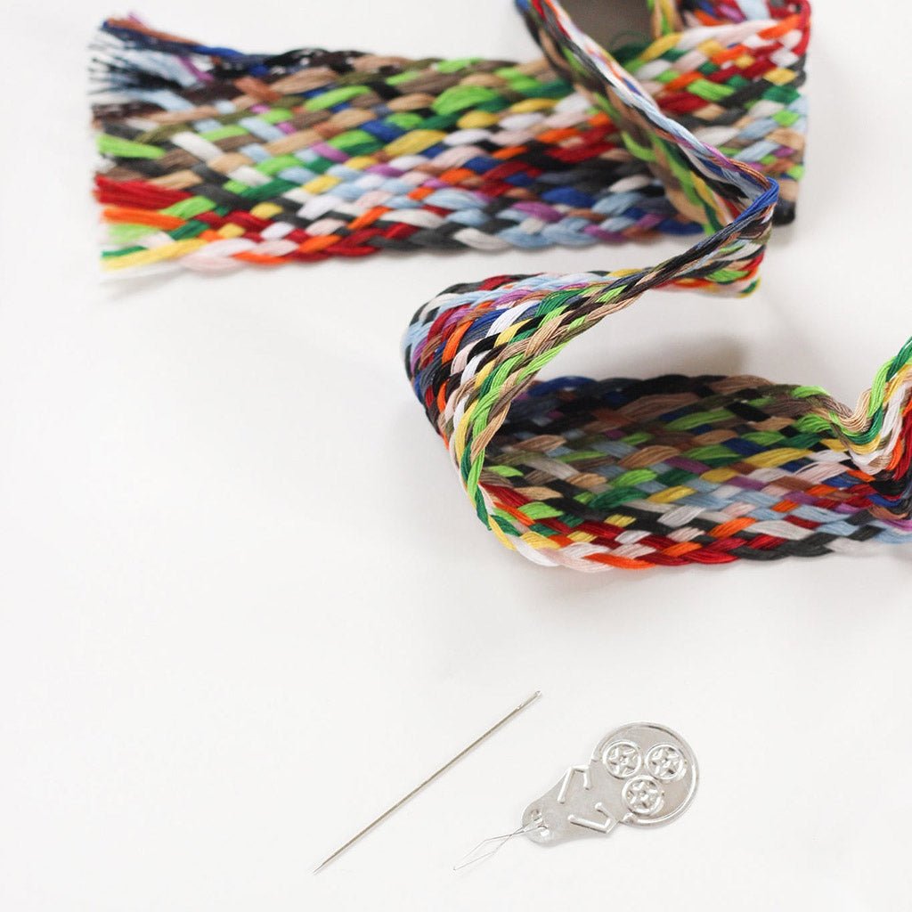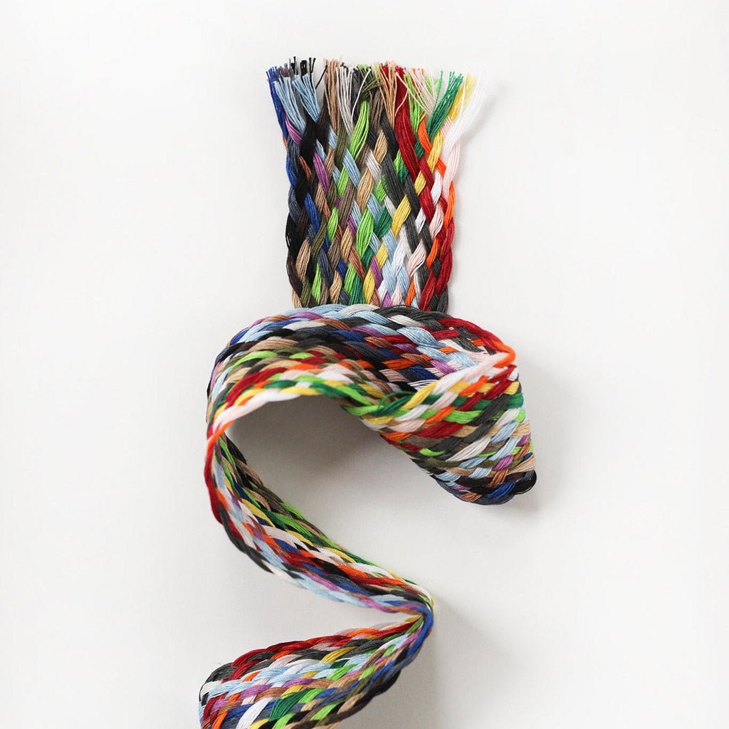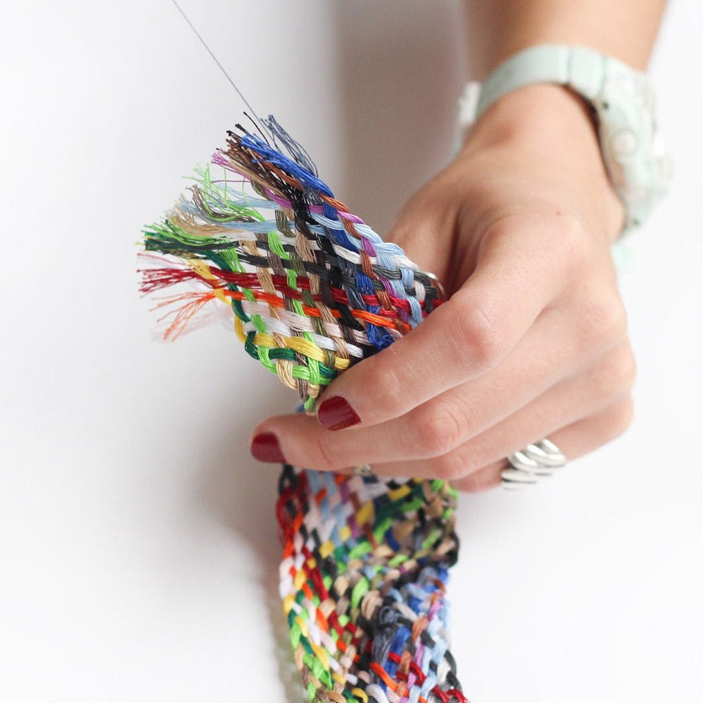 Introducing braided cotton thread from Italy; made to slip in your suitcase for travel or smaller projects on the go. Each braid comes in a multitude of 25 colors. Simply pull gently on the color you’d like to use, and it will slip out with ease from the larger braid of threads. Magic!