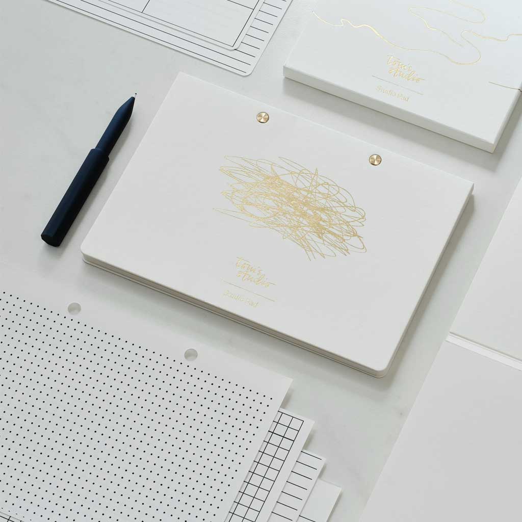 The Studio Pad is an A5-sized refillable notebook, complete with brass studs and smooth 116gsm paper. Gridded, lined, dotted, to-do, and weekly planner refills are included in the set, making the Studio Pad customizable to your liking—for writing, sketching, or brainstorming your next idea.