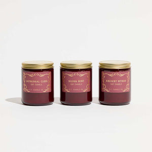 Celebrate the turn of a new season with the Equinox Candle collection by P.F. Candle Co. With earthy, ethereal notes of myrrh, clove, and petrichor, these three limited-edition scents conjure the magic of autumn—cool breezes, warm spices, and mossy forests. Each candle is hand-poured into a bordeaux glass jar, and finished with medieval-inspired gilded accents on a maroon kraft label.