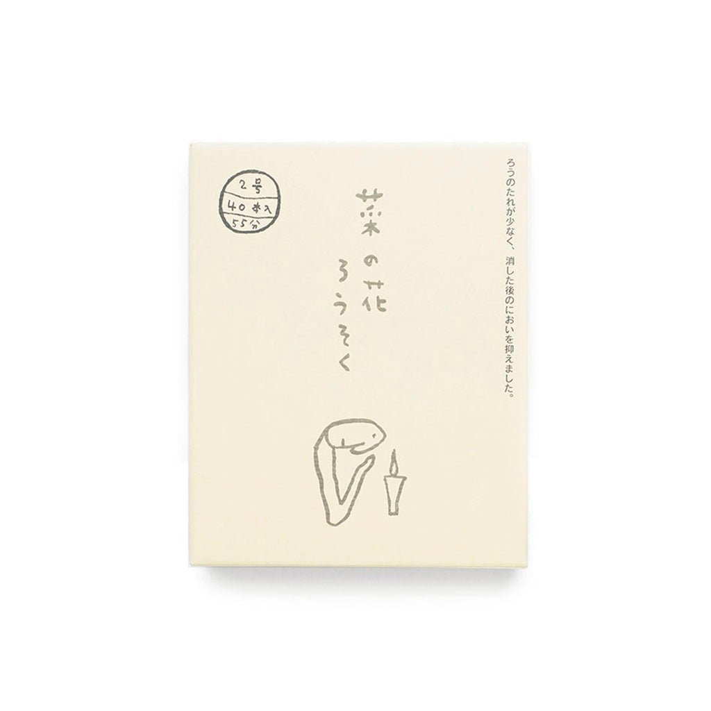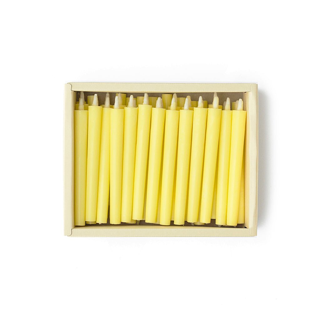 A set of 40 small, plant-based candles in a pale yellow gift box. Each candle has a 55 minute burn time and fits on Takazawa's Hammered Brass Candle Stand or Koma Small Candle Stand.